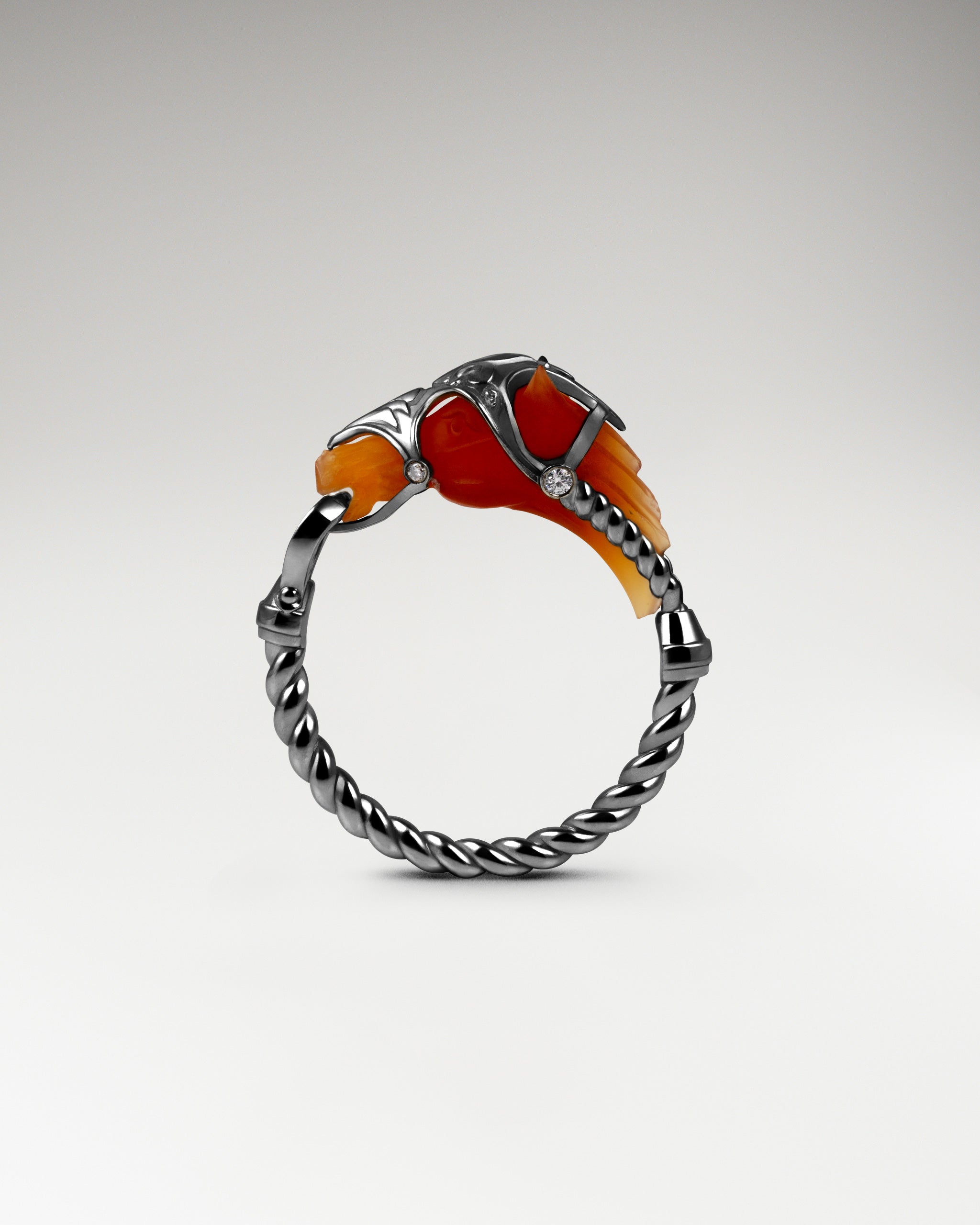 Dieses einzigartige Stück ist mehr als nur ein Ring; Es ist ein Statement der Individualität und eine Hommage an den ungezügelten Geist in uns. Der geformte schwarze Achat und das oxidierte Silber sorgen für Tiefe und Kontrast und verstärken den wilden Reiz des Designs. Der mit 0,06 ct Moissanit verzierte Ring funkelt mit einem subtilen, aber faszinierenden Glanz und symbolisiert die wilde und freie Natur, die er repräsentiert.