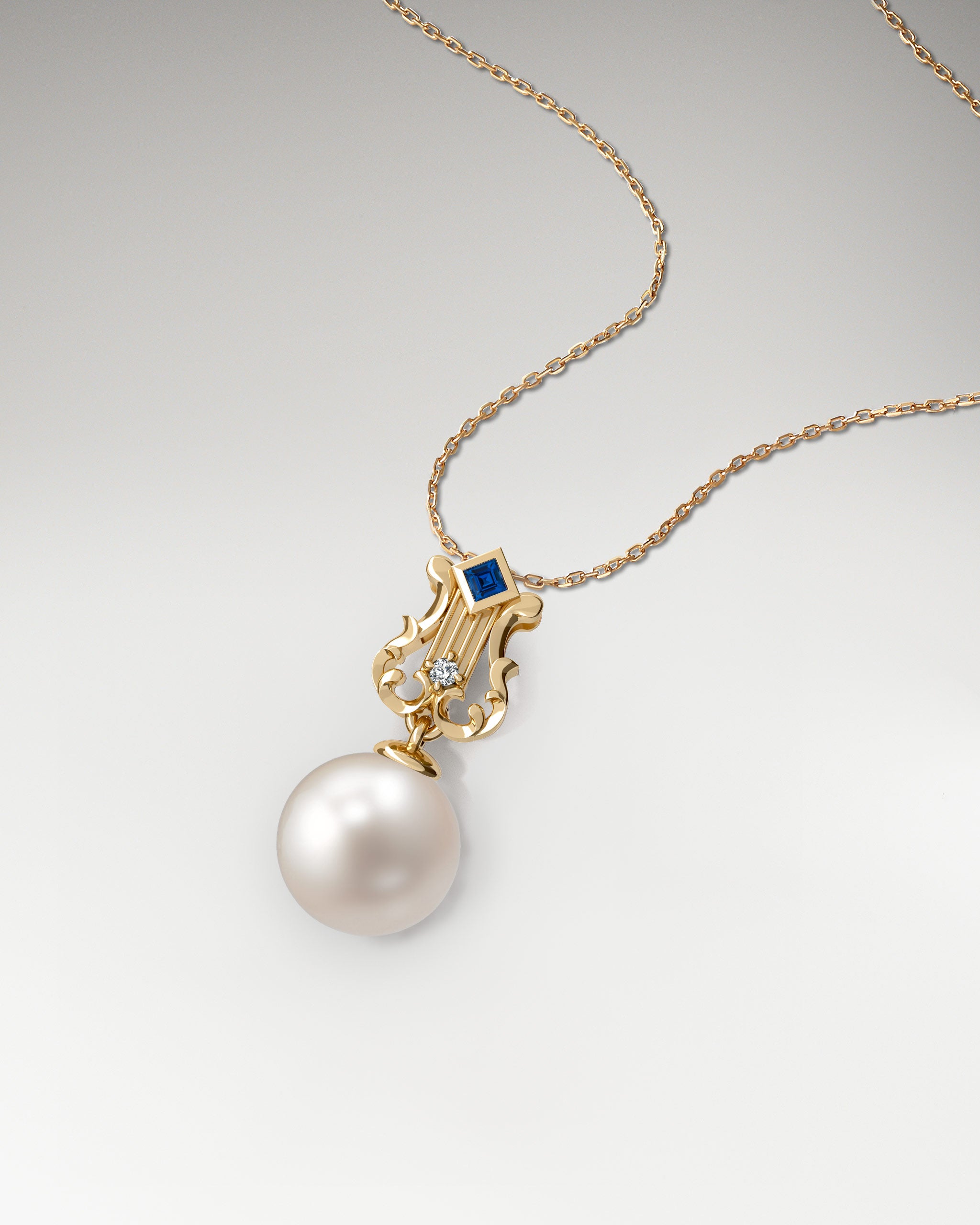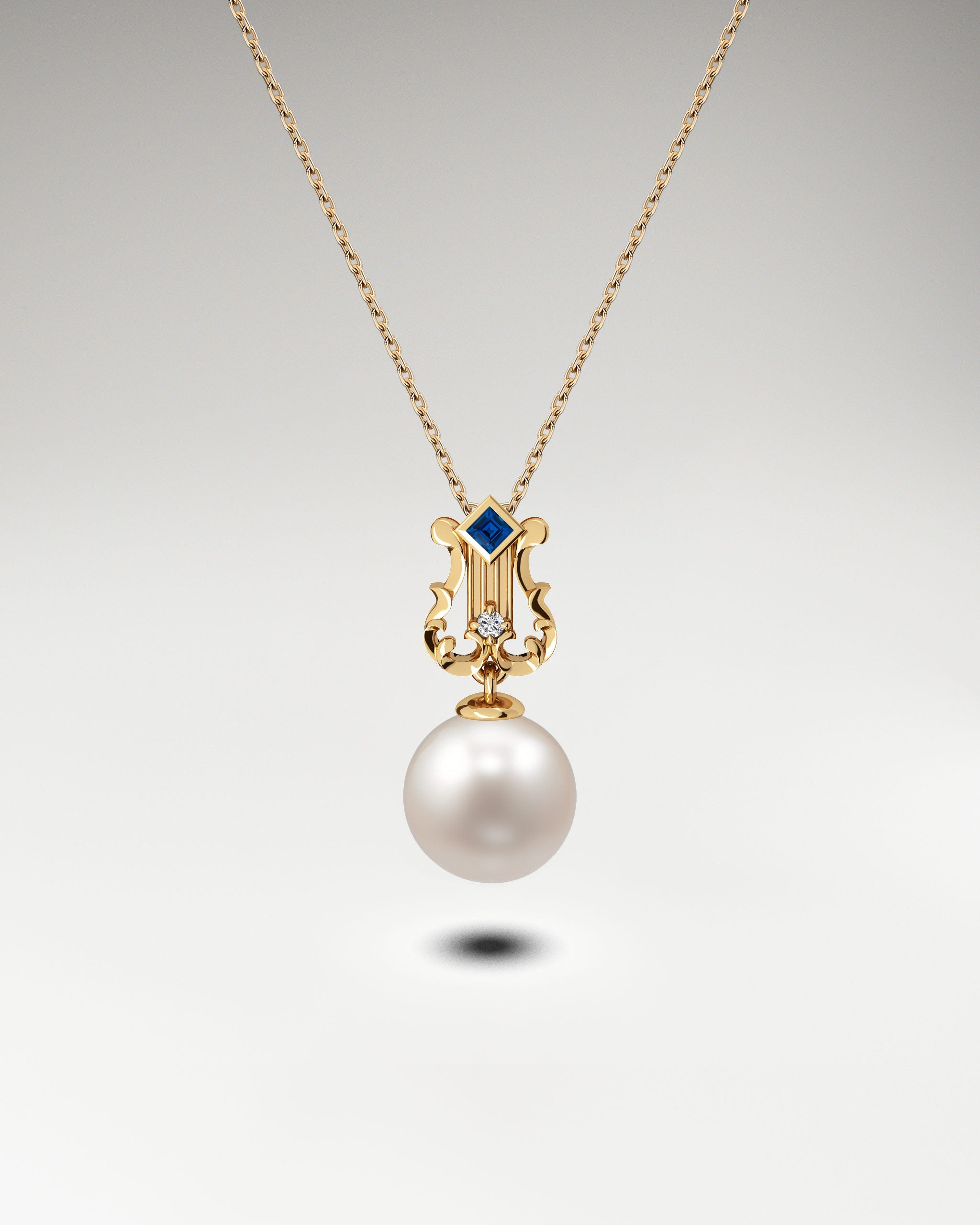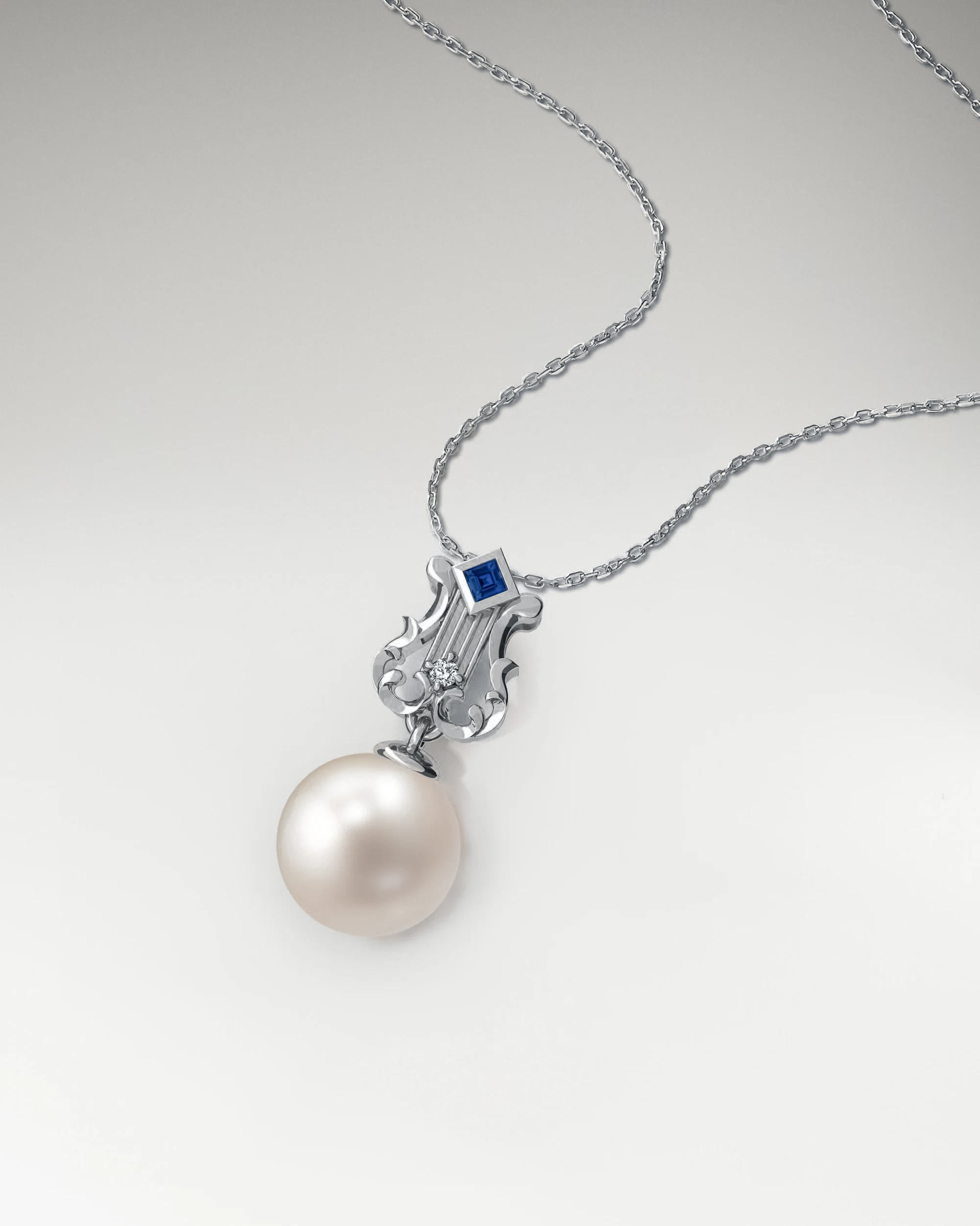 Rehaussé d'un délicat diamant de 0,01 ct et d'un saphir carré mesurant 1,5 mm x 1,5 mm, le collier offre une fusion harmonieuse d'or, de perle et de pierres précieuses. La perle, d'un diamètre de 8 mm, s'impose comme une pièce maîtresse de raffinement et de sophistication.