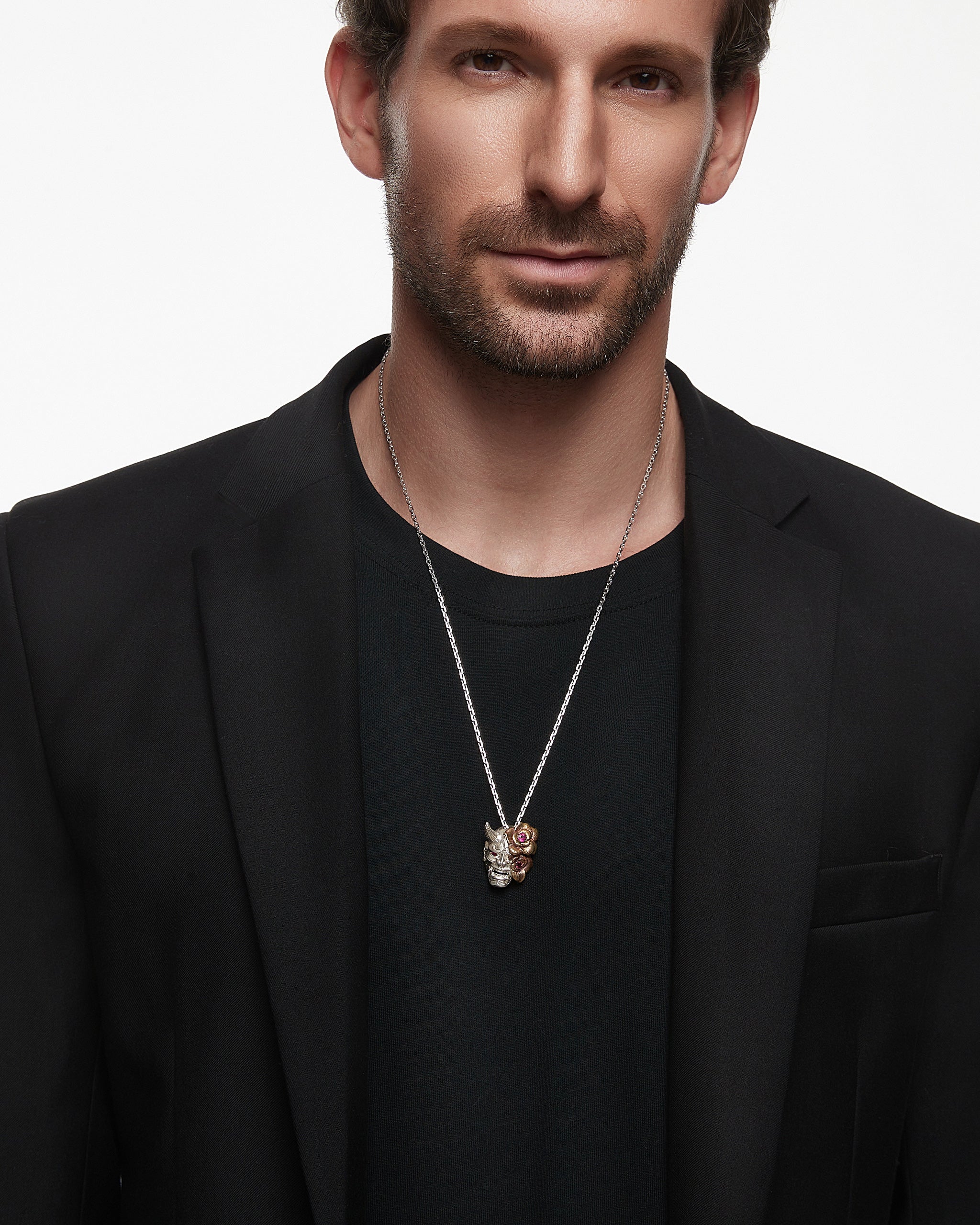 Der Hannya-Anhänger ist ein auffälliges Schmuckstück, das von der Hannya-Maske inspiriert ist, einem traditionellen Element des japanischen Noh-Theaters. Die Maske symbolisiert die Verwandlung einer von Eifersucht verzehrten Frau in einen Dämon, der sich durch Hörner, scharfe Reißzähne und einen wilden Gesichtsausdruck auszeichnet. Bei Noh-Aufführungen wird diese Maske getragen, um rachsüchtige weibliche Charaktere darzustellen und der Bühne eine Aura von Intensität und Dramatik zu verleihen.