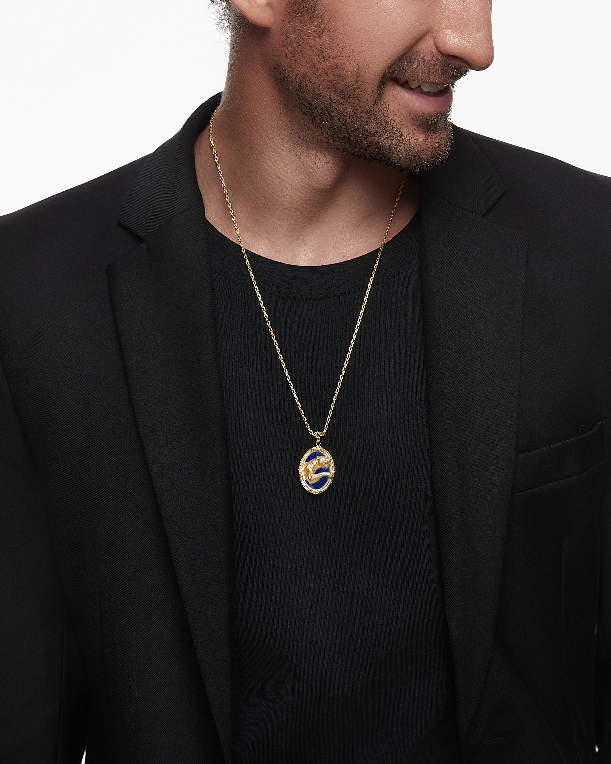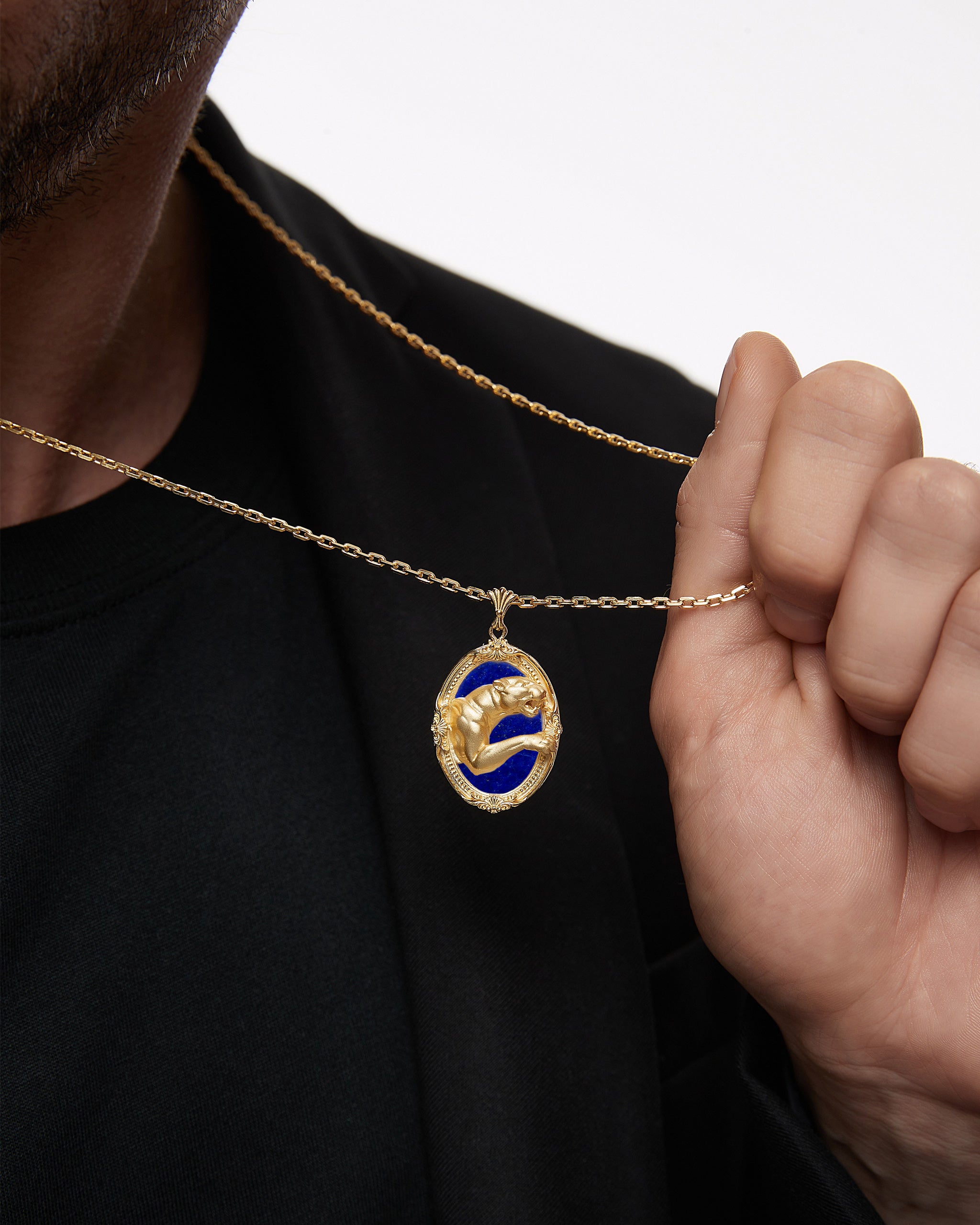 Le pendentif Savanna Spirit présente un design vintage et une construction en or massif, capturant la scène vivante d'un guépard courant à travers la savane. Fabriqué en argent sterling. L'ajout de Lapis Lazuli ajoute une touche de mystère et d'élégance.